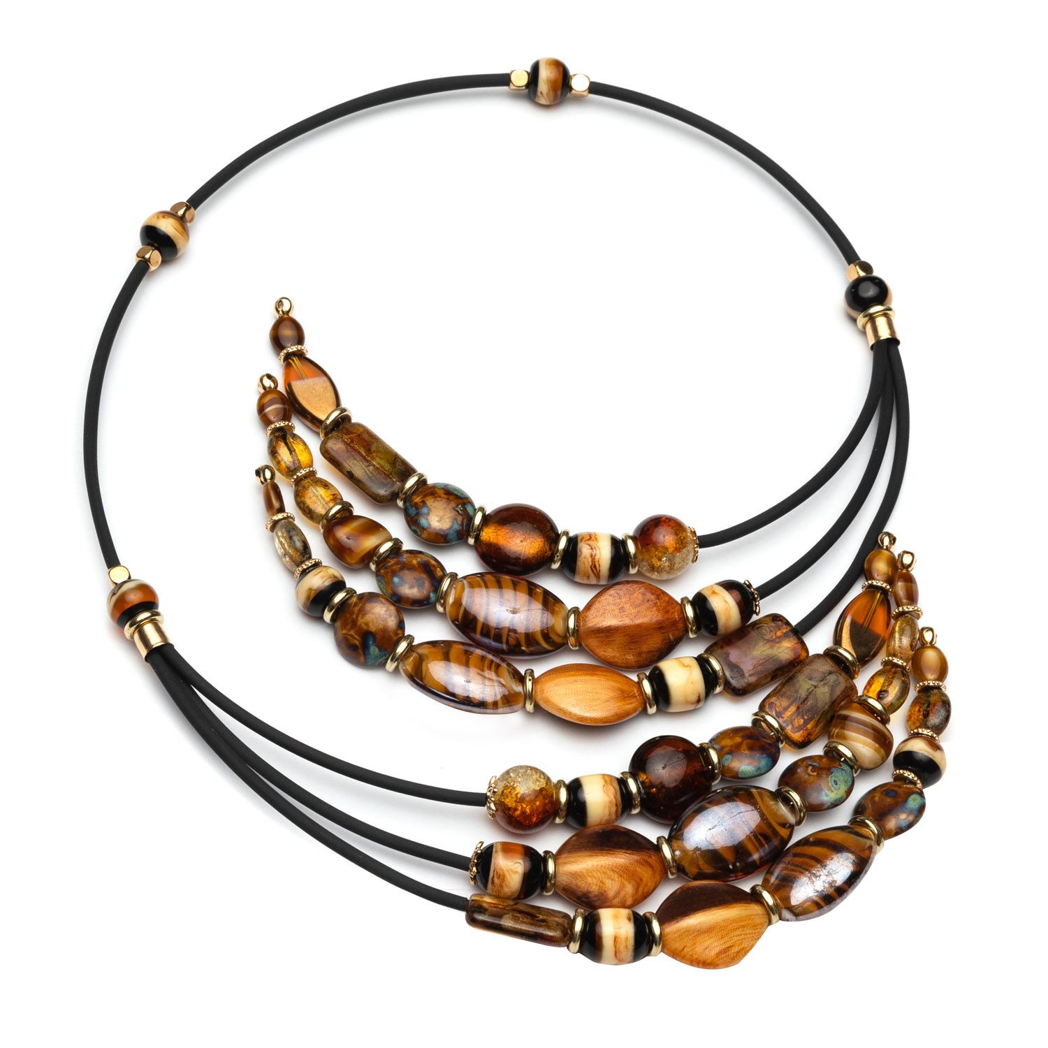 Оригинальное колье лапы на каучуковом шнуре с памятью. Каждый из концов колье заканчивается трехрядным разветвлением, выполненным из элементов муранского и чешского стекла, а также французского полимера. Надев это колье, вы почувствуете себя королевой любого мероприятия.