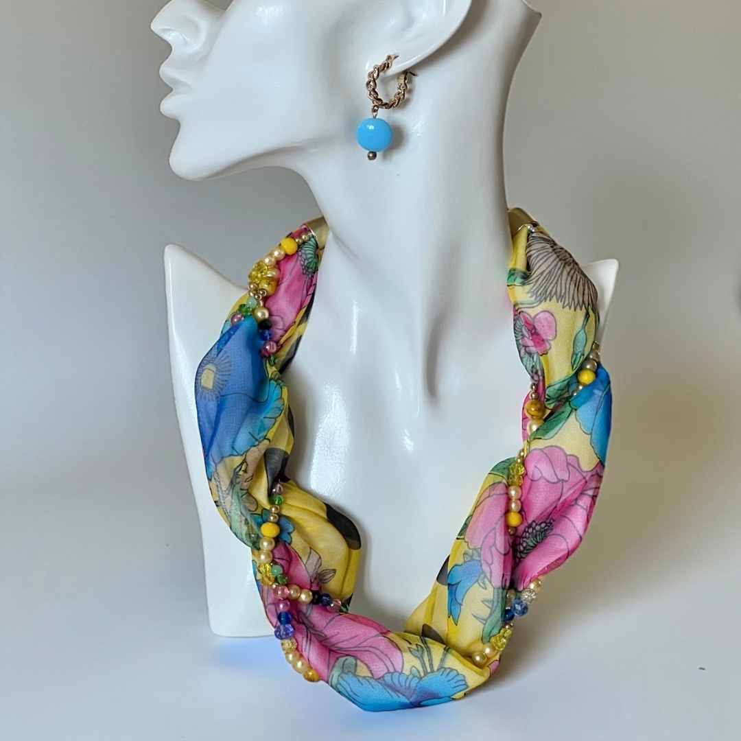 Нежная шифоновая косынка-ожерелье с подобранной в тон ткани чешской бижутерией гармонично дополнит ваш образ.