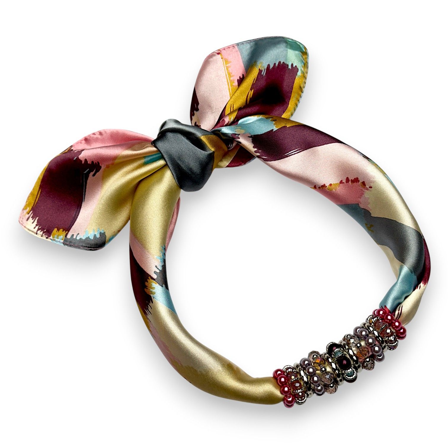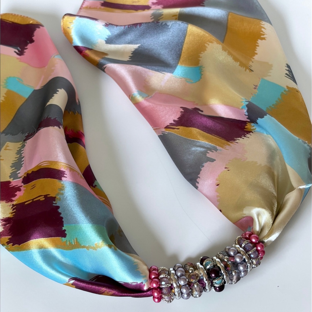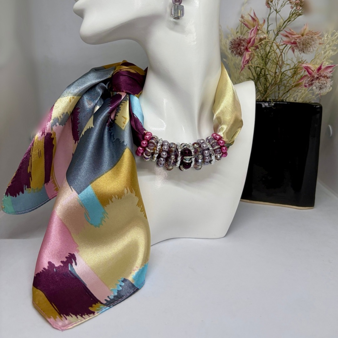 Стильная косынка-ожерелье с подобранной в тон ткани бижутерией гармонично дополнит ваш образ.