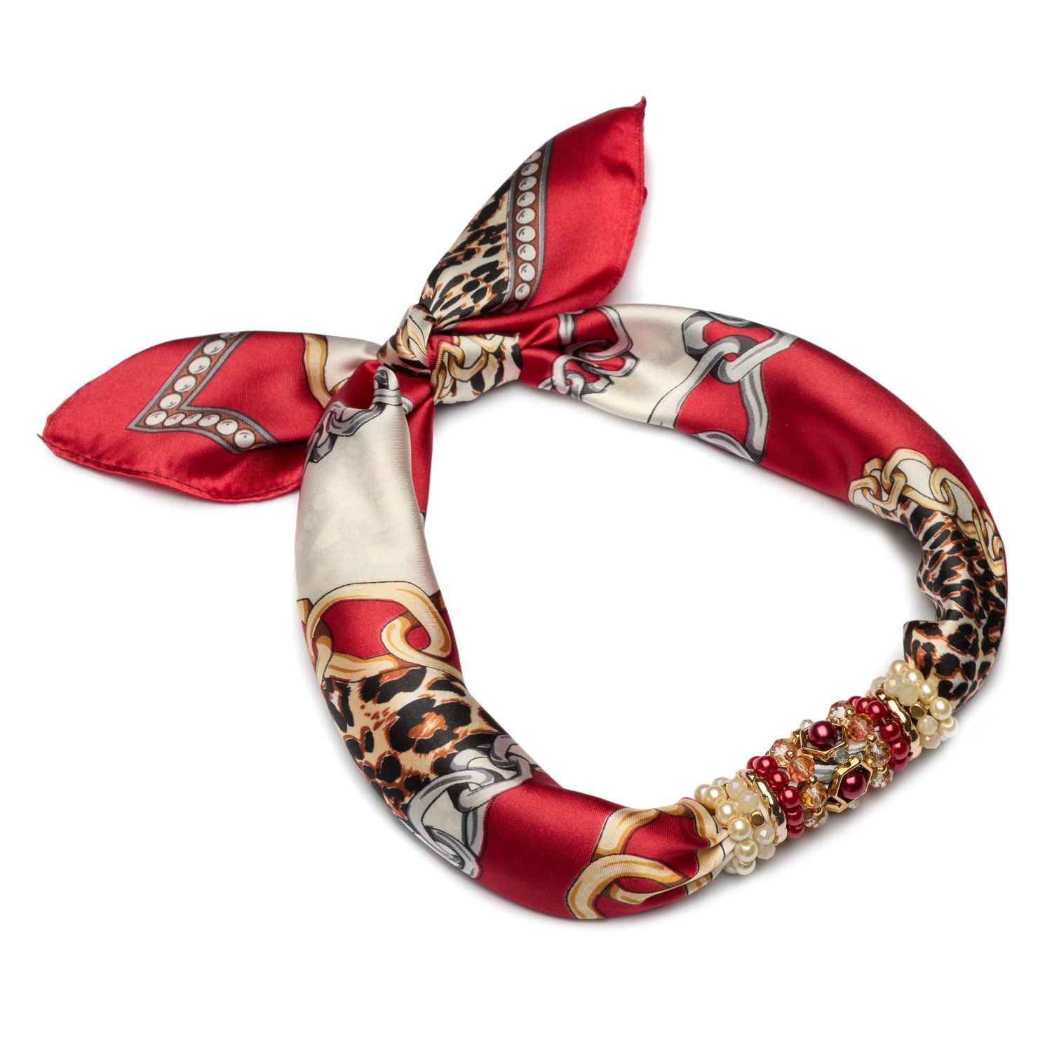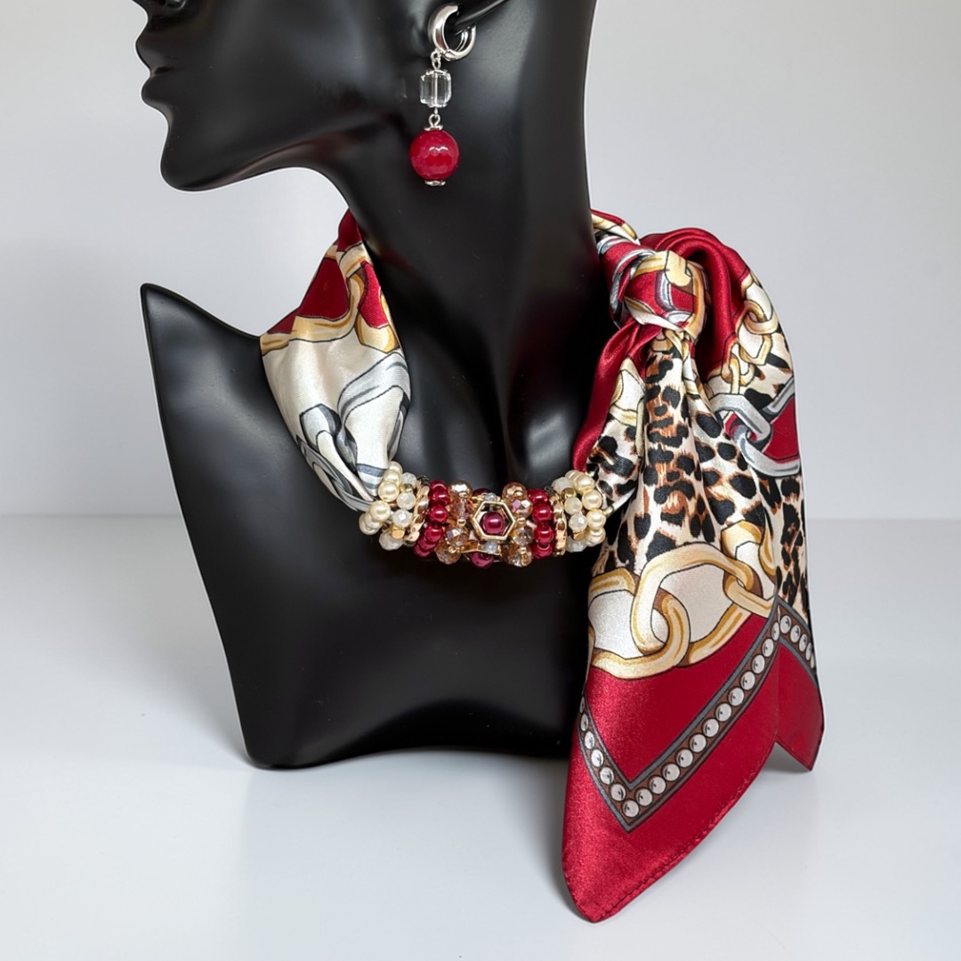 Стильная косынка-ожерелье с подобранной в тон ткани бижутерией гармонично дополнит ваш образ.