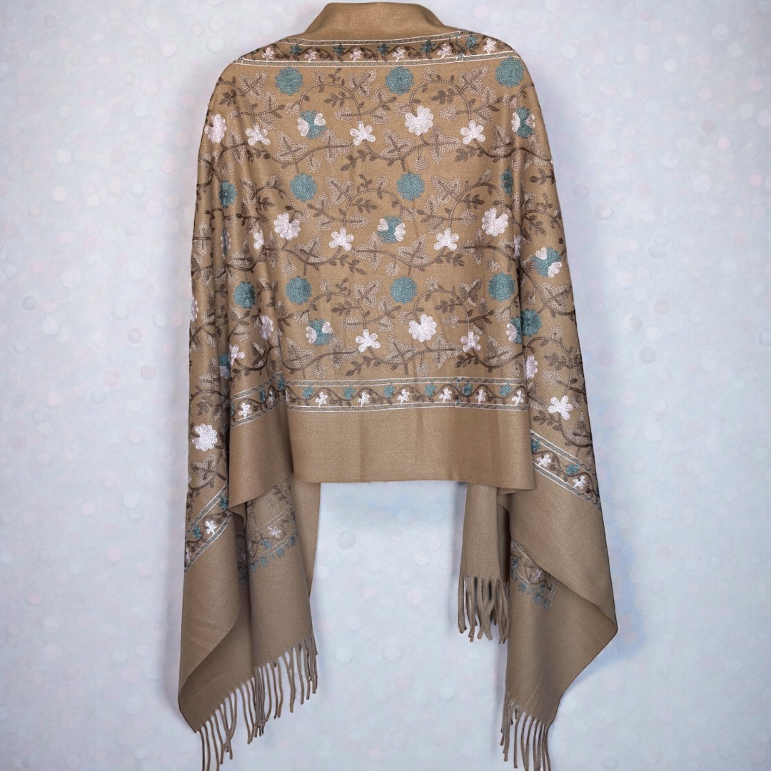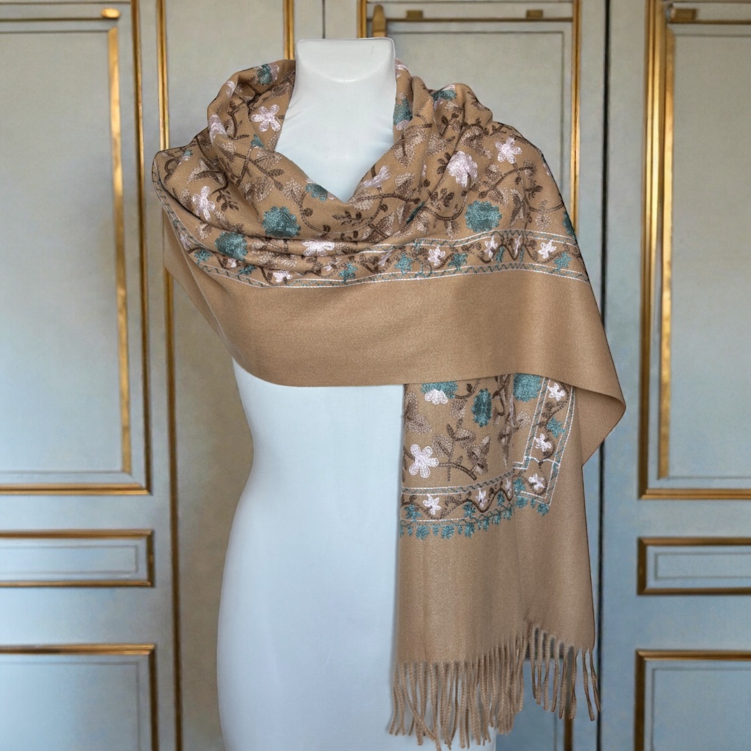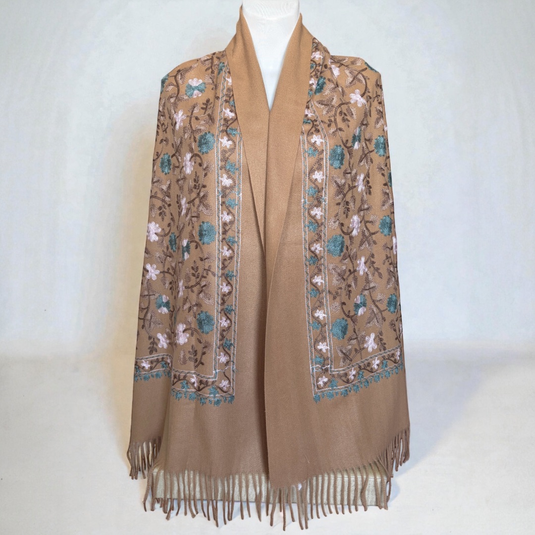 Классический кашемировый палантин с нарядной бахромой по краям украшен великолепной шелковой вышивкой, выполненной мастерами-вышивальщицами машинным способом.