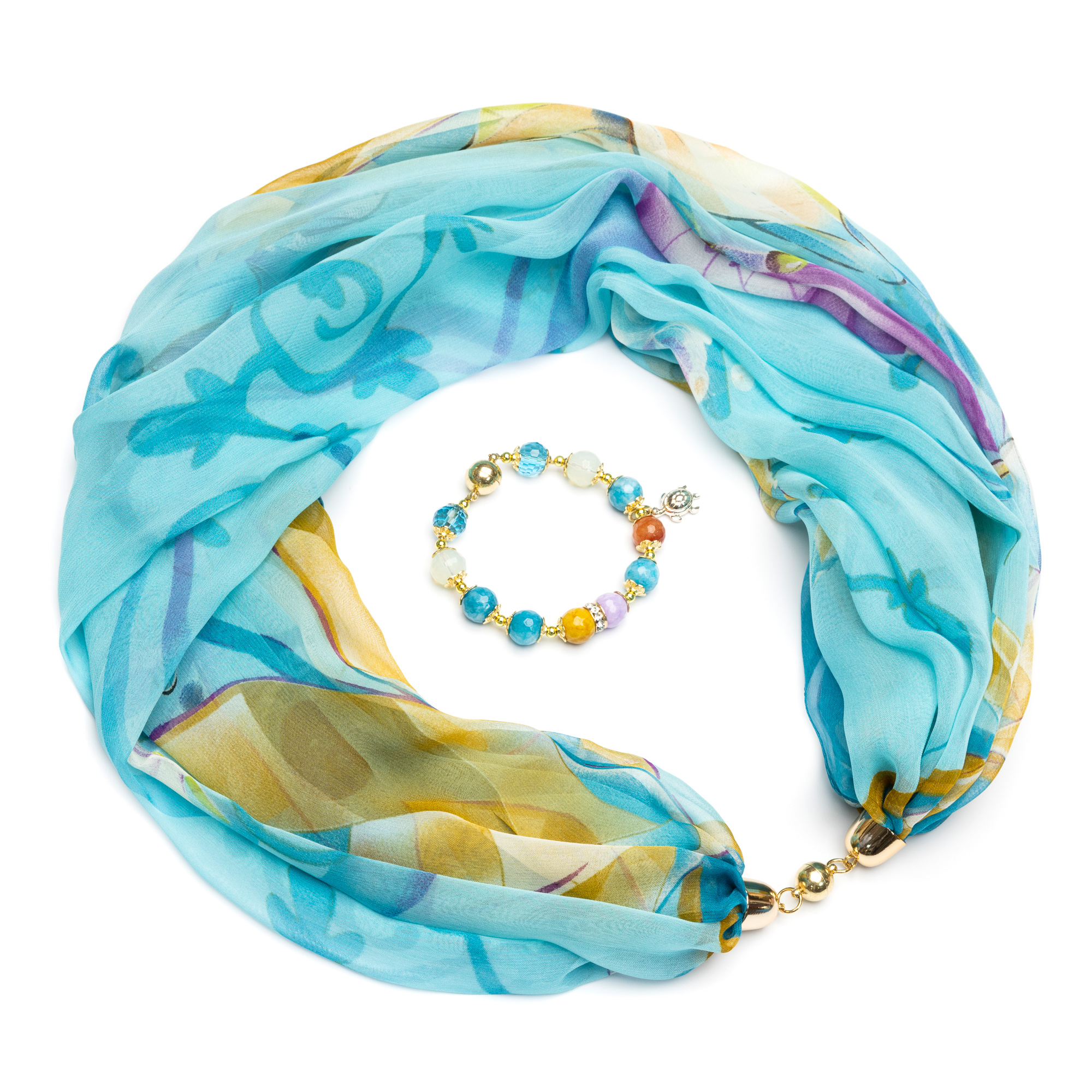 Дизайнерский платок из нежного шелкового шифона дополнен ожерельем из натурального камня – агата.