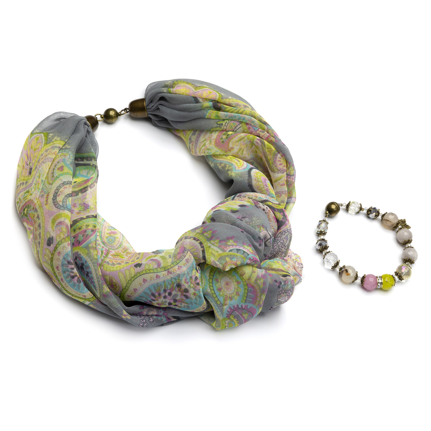 Дизайнерский платок из нежного шелкового шифона дополнен ожерельем из натурального камня – агата.