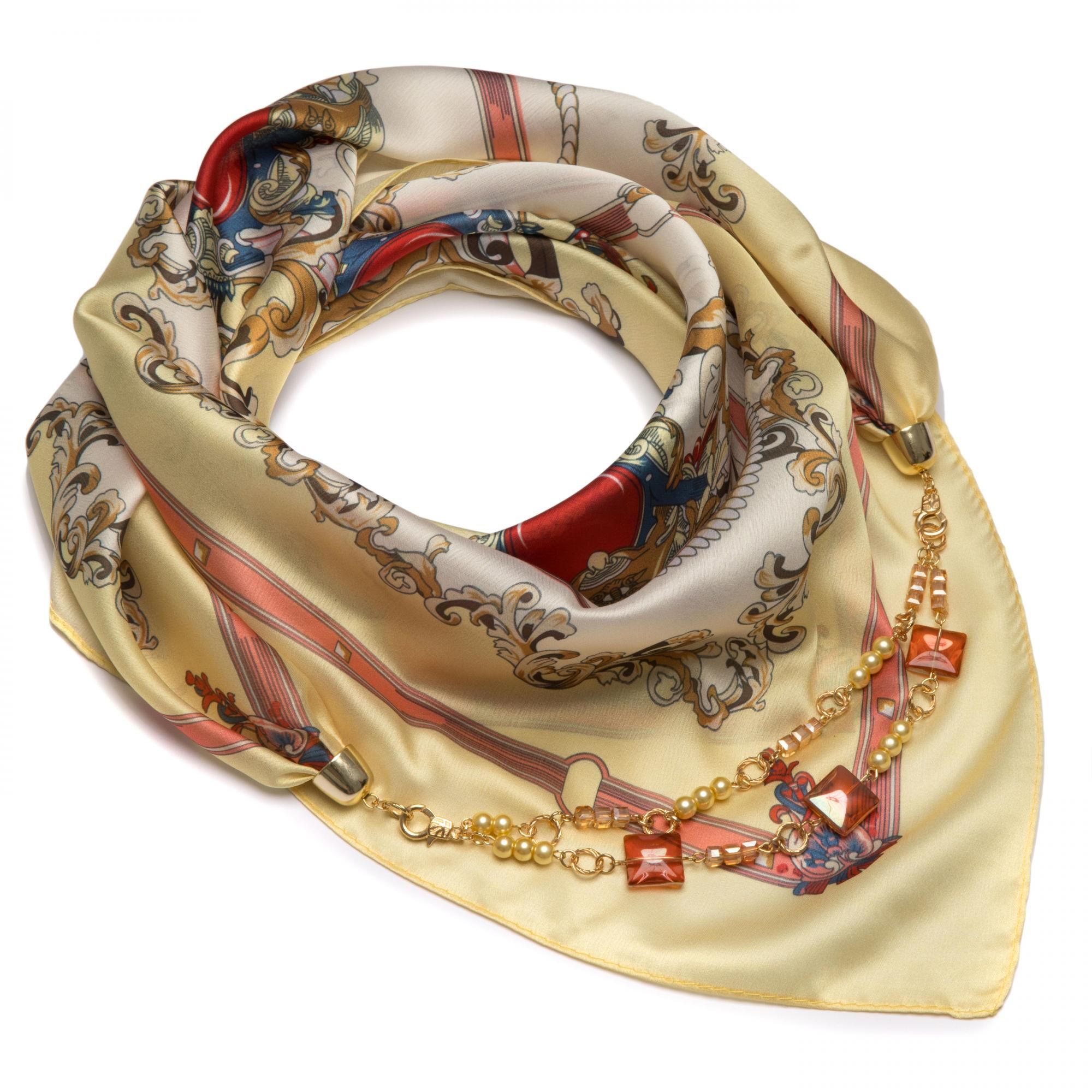 Благодаря двум замочкам-карабинам аксессуар можно носить разными способами, а бижутерную часть использовать, как полноценный браслет. Платок Ангелина способен преобразить каждый наряд и стать ярким аккордом в любое время года.