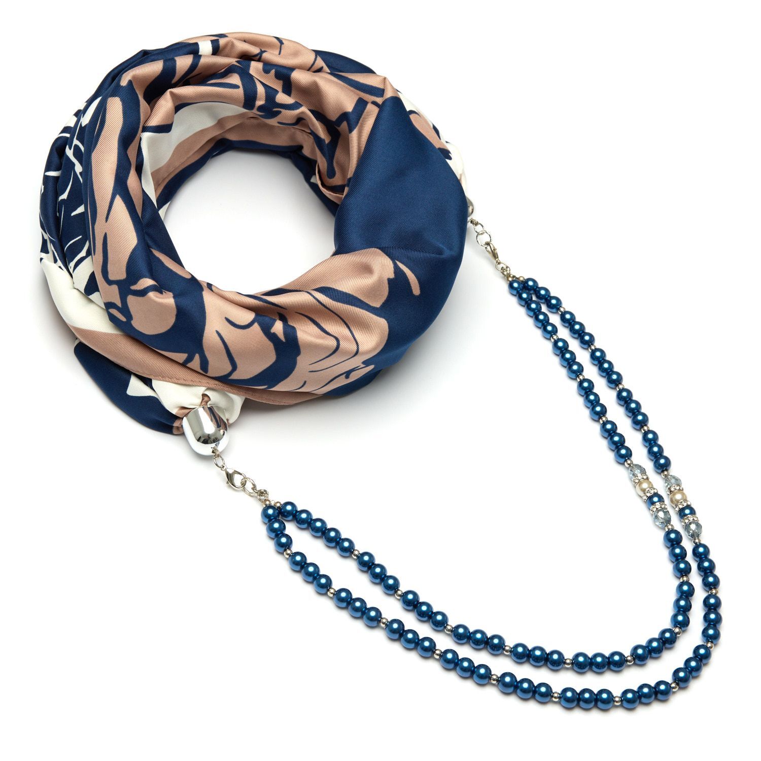К платку с помощью карабинов крепится двурядное ожерелье из искусственного жемчуга и чешского стекла длиной 45 см.