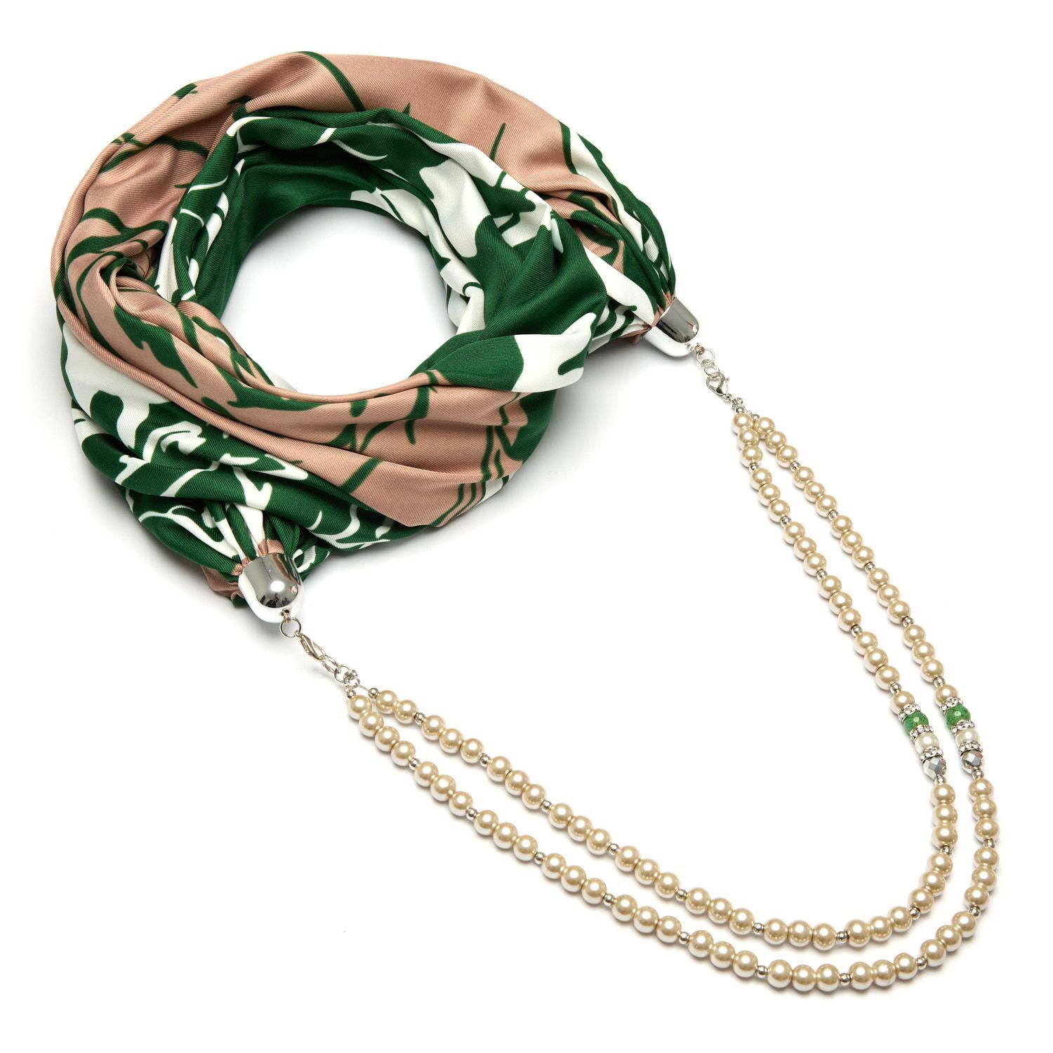 К платку с помощью карабинов крепится двурядное ожерелье из искусственного жемчуга и чешского стекла длиной 45 см.