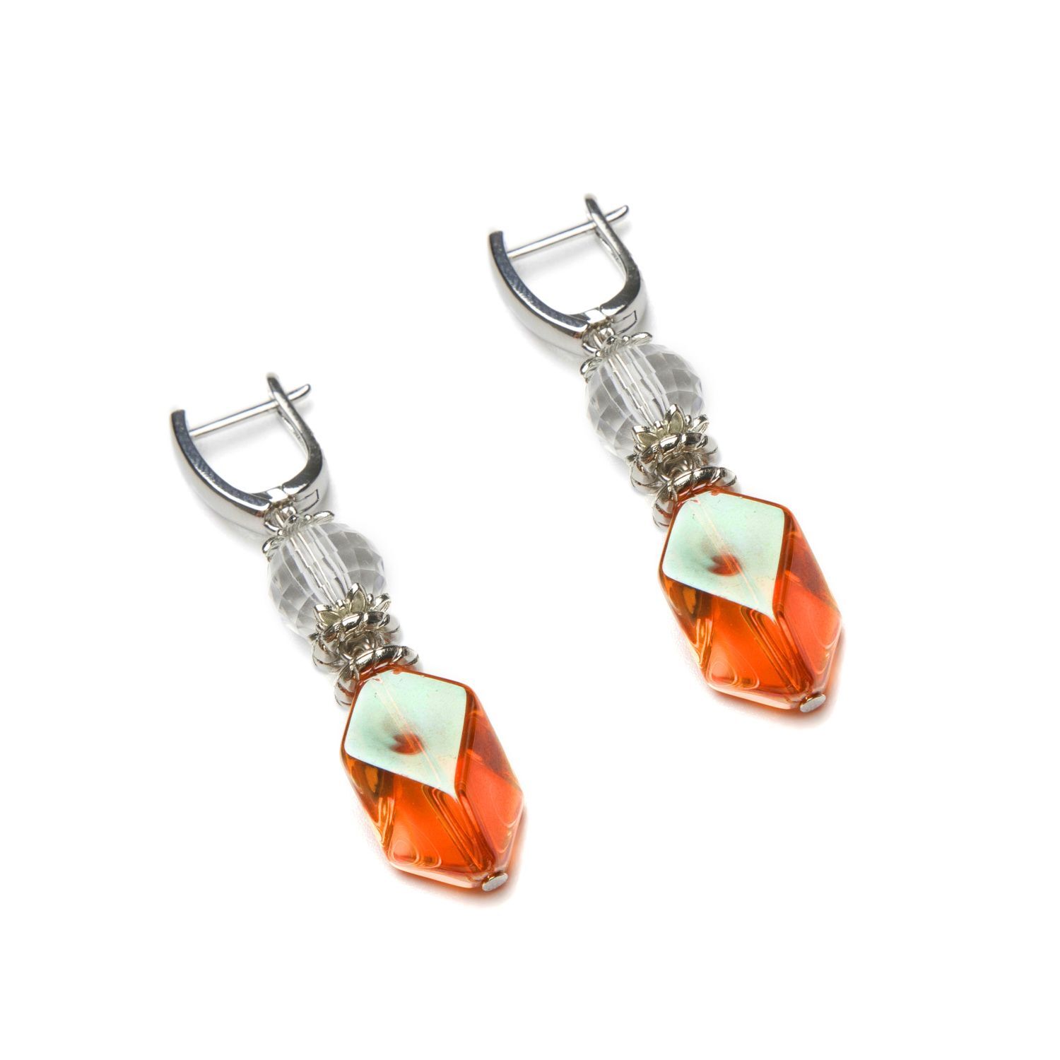 Оригинальные серьги на английском замке с подвесками, выполненными из элементов чешского стекла и французского полимера.