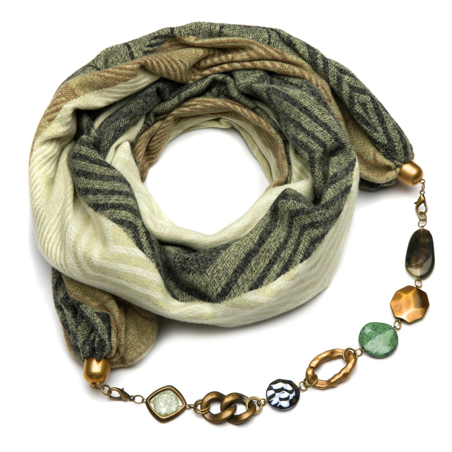 Бижутерия - оригинальное украшение, произведённое из качественного гипоаллергенного металла, практически невесомого французского пластика и керамики, нанизанное вручную и подобранное к каждому шарфу индивидуально.